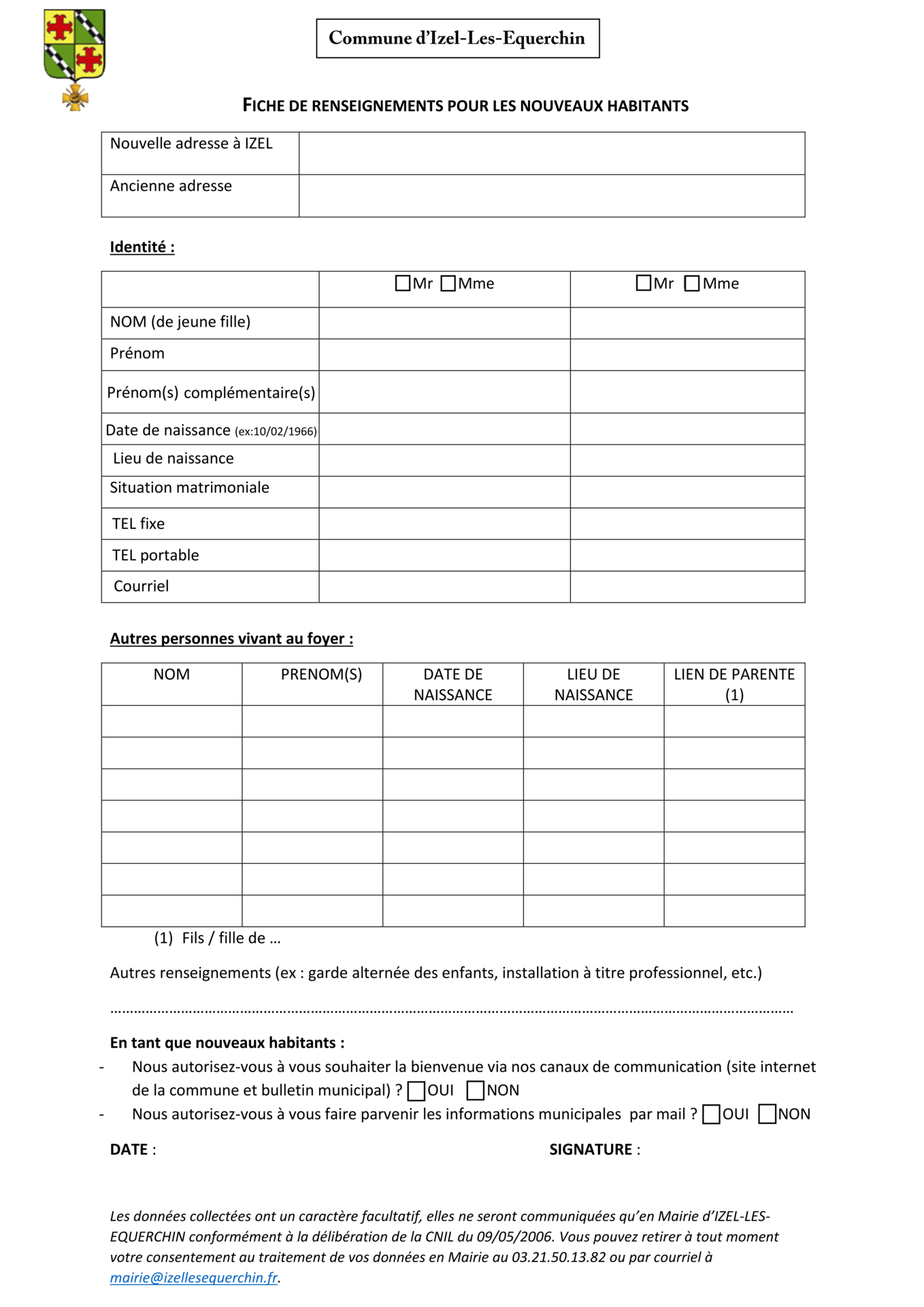 Bienvenue aux nouveaux habitants ! Faites-vous connaître auprès de la mairie en complétant et renvoyant le formulaire ci-dessous.